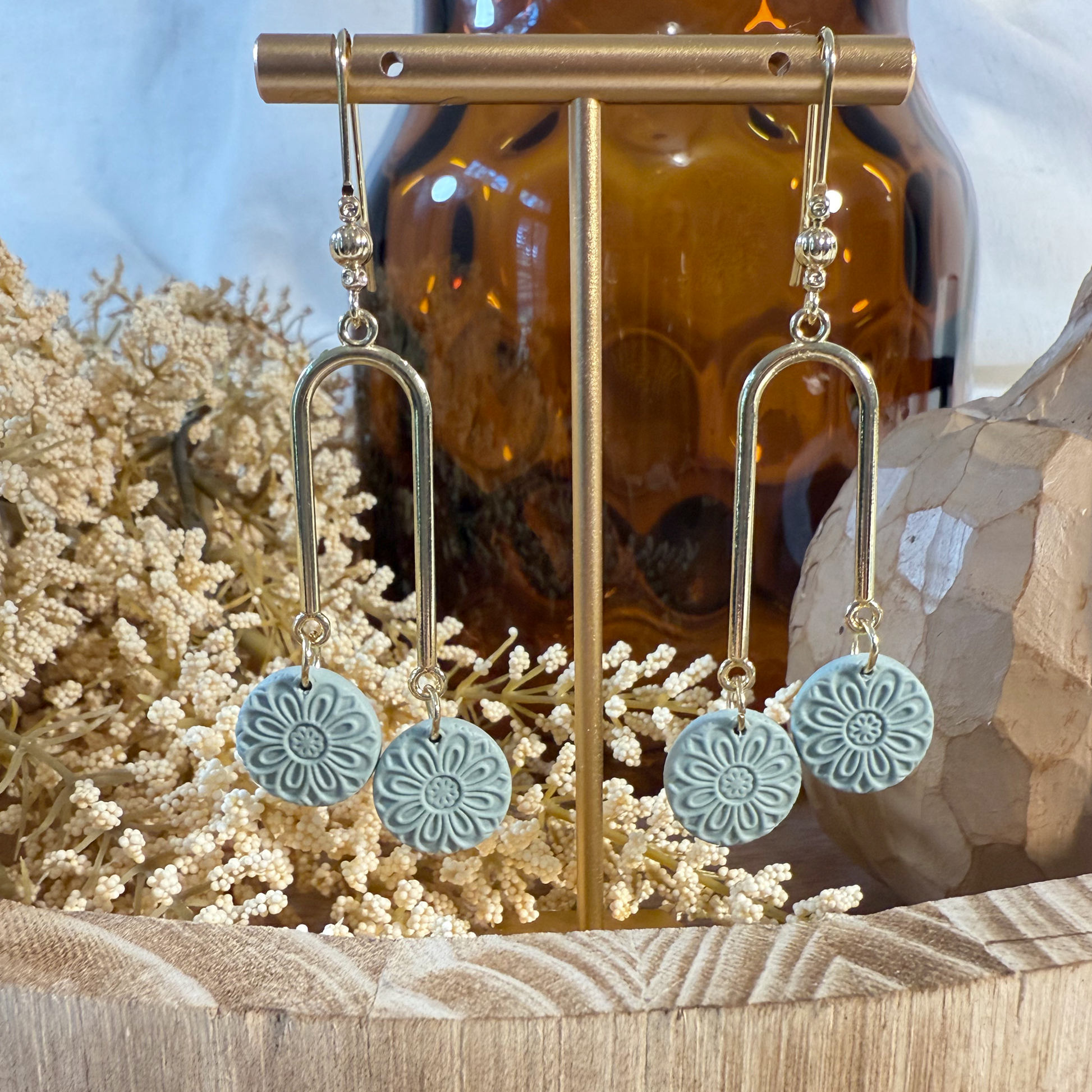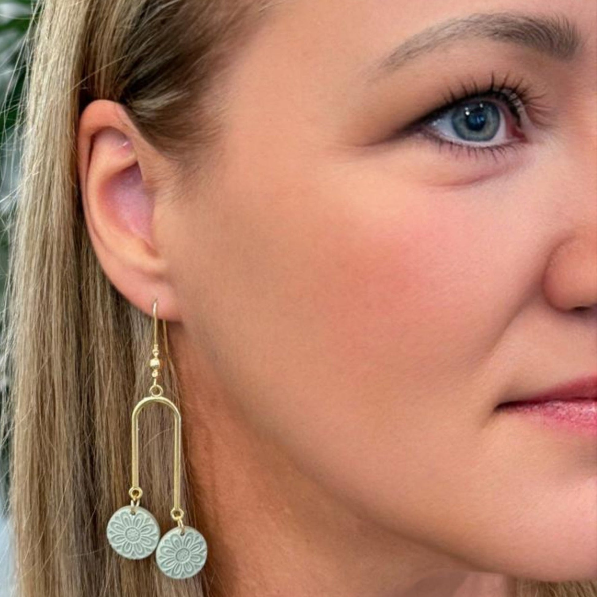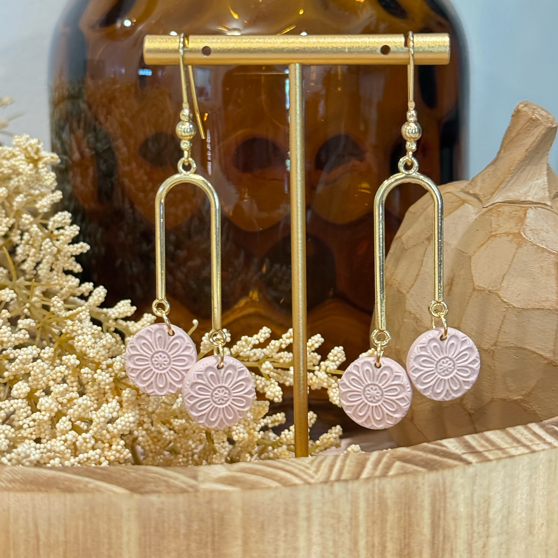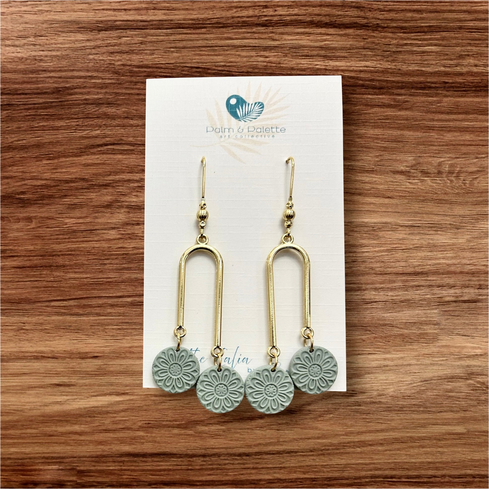 Effortlessly modern with an artistic edge, The Calia is a fresh take on minimalist design with just the right amount of movement and shine. Each earring features two hand-crafted polymer clay discs with a mandala texture, dangling from a sleek 18k gold plated u-shaped chandelier connector for a playful look.