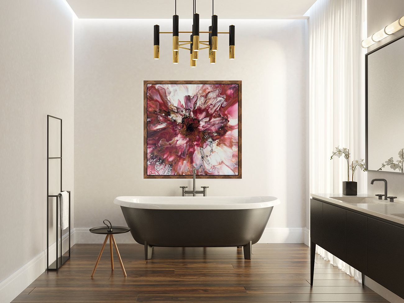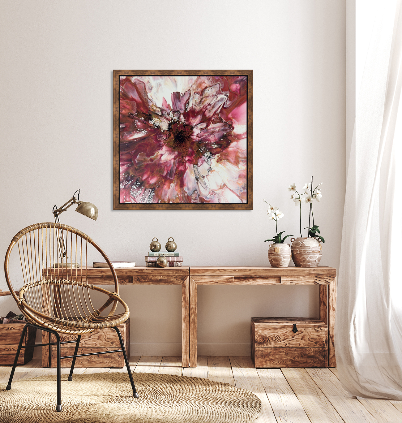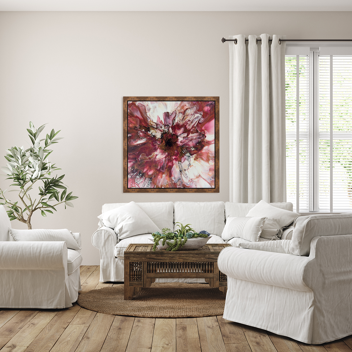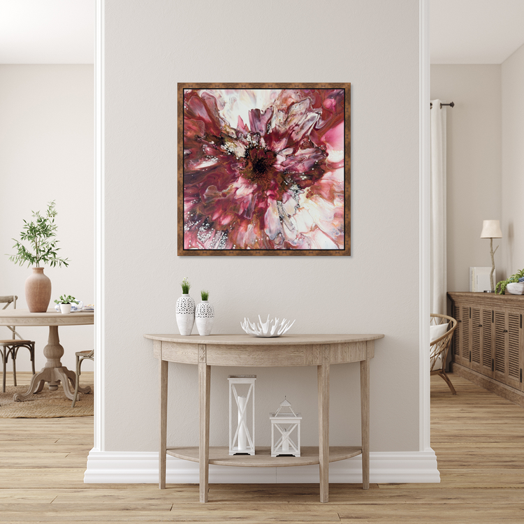 This stunning acrylic painting print captures the essence of elegance and boldness. This piece is a symphony of rich crimson hues intertwined with lustrous white, creating a captivating bloom design that dances across the canvas. The infusion of 24-karat gold adds a touch of opulence, glimmering like sunlight caught in a cascade of petals. Black lacing weaves through the composition, providing depth and contrast, drawing the eye into the intricate layers of color and texture. Each stroke tells a story, inviting you to explore the delicate interplay between light and shadow.